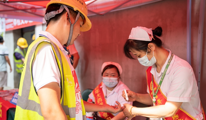活动现场,十七冶南京分公司、雨田社区的有关领导共同为施工人员送上饮料、西瓜等防暑降温物资,并发放仁丹、十滴水等药品,细心询问了解他们的健康状况,叮嘱大家在工作的同时保护好自己,注意防暑降温;要求分包单位要进一步落实防暑降温措施,注重高温下的施工防护,妥善安排好施工时间,严格禁止高温时间段施工作业。随后百年大药房的工作人员还免费为工人送来药品,为他们量血压、按摩肩颈等。十七冶医院银塘卫生院的医护人员对高处作业人员进行抽血化验、测心电图等义诊服务,为酷热天气奋战在高温一线的工人送去平安健康。