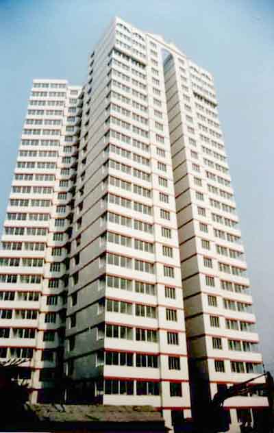该工程高73.1米,地上24层,地下一层,建筑面积15800平方米,呈蝶形布置,中间为筒体结构的内廊,每层八户二室一厅,钢筋混凝土剪力墙结构,混凝土等级C40,工期18个月。工程施工结束时进行了检测,上下偏差仅30mm,精度4/1000,装修工程完全符合质量标准,实现了优质、安全、高效的目标,2000年被上海浦东建筑业协会评为“东方杯”、在上海浦东新区“世纪杯”优秀住宅评比中荣获“创无质量通病成果奖”。