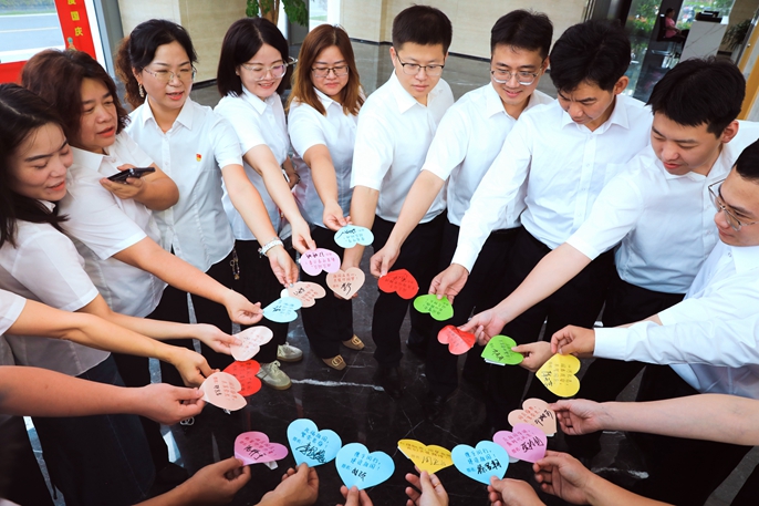 本次活动在现场设置了“签名墙”,邀请广大干部职工在在大幅中国地图上,抒发对祖国真挚的情感,将心里话说给祖国听。每位员工抚摸地图,将对党和国家的深厚情感化作妙语佳句,写进心形卡片,就像许下一声声坚定的誓言,一个个名字聚集在红心之中,让信心和力量在每个人的心中不断汇聚升腾。“祝祖国母亲生日快乐”“祝福祖国更加繁荣昌盛”一句句饱含深情的祝福,一句句朴实简单的话语,承载着浓浓的祝福,寄托着对祖国美好明天的憧憬和期待。