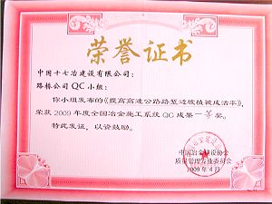 42022日,在山东青岛举行的2009年度全国冶金施工系统QC成果发布上,中国十七冶六篇QC成果分获一等奖和二等奖。来自全国冶金施工企业24个单位的195QC成果参加发布交流,这些成果代表着全国冶金施工企业QC成果的最高水平。