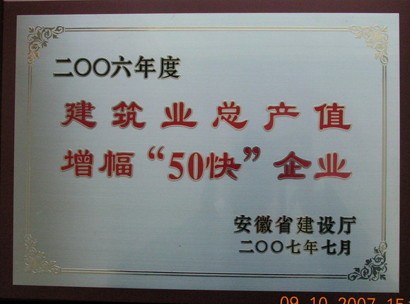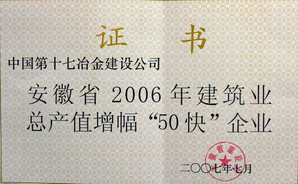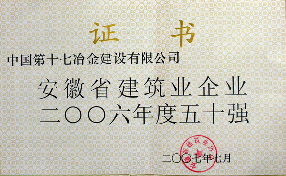 记者日前从省有关部门获悉:十七冶有限公司以优异的业绩荣获“安徽省建筑业企业2006年度50强”和“安徽省2006年建筑业总产值增幅‘50快’企业”两项荣誉称号,分别受到安徽省建筑业协会和安徽省建设厅的表彰。
