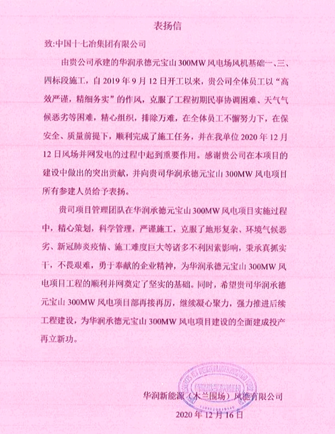 华润新能源公司向十七冶致表扬信