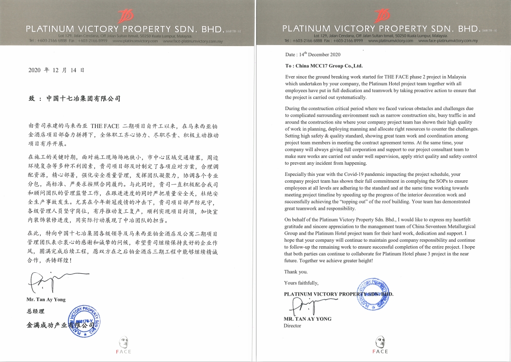 近日,马来西亚金满成功产业有限公司向中国十七冶集团致表扬信,对房屋工程技术分公司马来西亚吉隆坡铂金酒店及公寓二期工程项目部取得的突出业绩给予充分肯定,并提出表扬。