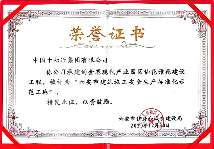 1月22日,从安徽省六安市住房和城乡建设局获悉,中国十七冶集团房屋分公司金寨仙花雅苑项目荣获2020年度“六安市建筑施工安全生产标准化示范工地”称号。