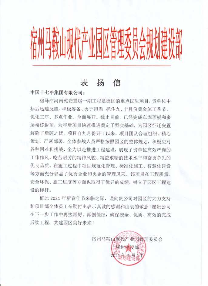 2月1日,宿州马鞍山现代产业园规划建设部向中国十七冶集团发来表扬信,对房屋分公司宿马汴河南苑安置房一期项目部在项目建设过程中所做出的贡献表示感谢。