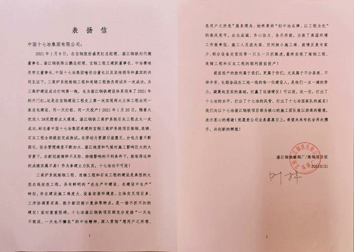 1月31日,湛江钢铁炼钢厂向中国十七冶集团致表扬信,对宝钢湛江项目部在劳动力资源日益匮乏、安全管理难度不断加大、湛江地质和气候对施工影响巨大的大背景下以及在新冠疫情猝不及防、持续影响的不利条件下,取得三高炉系统炼钢工程和连铸工程热负荷试车一次成功这样的成绩表示由衷的敬意和感谢。