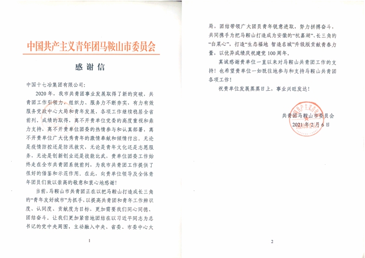 2月8日上午,共青团马鞍山市委副书记、市青联主席胡宏扬到中国十七冶集团调研并致感谢信,公司工会主席、副总经济师、党委组织部部长魏致家出席调研。