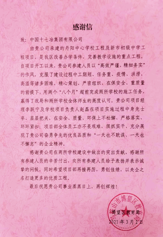 3月8日,马鞍山市博望区教育局向中国十七冶集团致感谢信,对管廊工程技术分公司马鞍山市博望区“宁博一体化”基础设施补短板EPC总承包项目部高质量完成两所学校建设予以表扬。