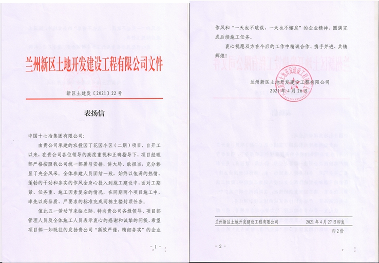 4月27日,兰州新区土地开发建设工程有限公司向中国十七冶集团致表扬信,对甘肃分公司承建的农投园丁花园小区(二期)项目如期履约,按时完成各项施工节点任务提出表扬。