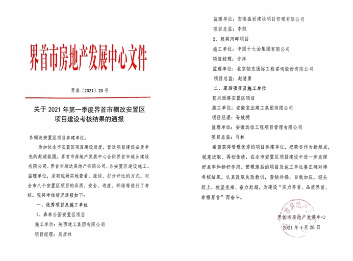 近日,从界首市房地产发展中心获悉,中国十七冶集团冶金工程技术分公司承建的界首市城投首居聚英河畔项目在界首市2021年第一季度界首市棚改安置区项目建设考核结果中荣获“优秀项目及施工单位”荣誉。