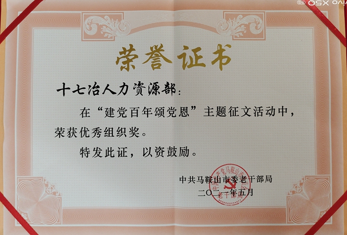 近日,在马鞍山市老干部局举办的“庆祝中国共产党成立100周年”主题摄影和征文活动中,中国十七冶集团离退休老干部涌跃参与,人力资源部获“优秀组织奖”,离退休老干部齐建生等获得主题征文优秀奖,韩伟群获主题摄影二等奖。