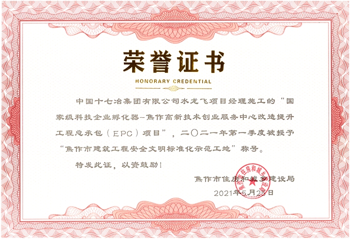 6月1日,中冶置业(安徽)公司承建的河南焦作高新技术创业服务中心改造提升工程项目被评为“焦作市建筑工程安全文明标准化示范工地”。