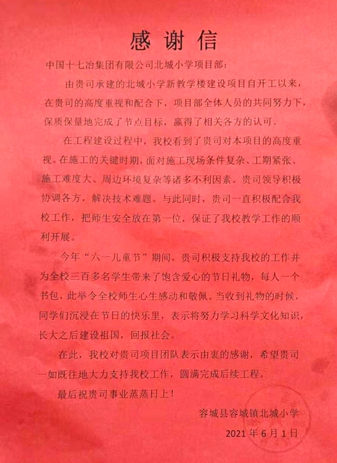 6月1日,河北保定容城县容城镇北城小学向中国十七冶集团致感谢信并赠送锦旗,对十七冶交通分公司北城小学新教学楼建设项目部保质保量地完成节点目标以及对工程建设的高度重视和配合致以诚挚感谢。