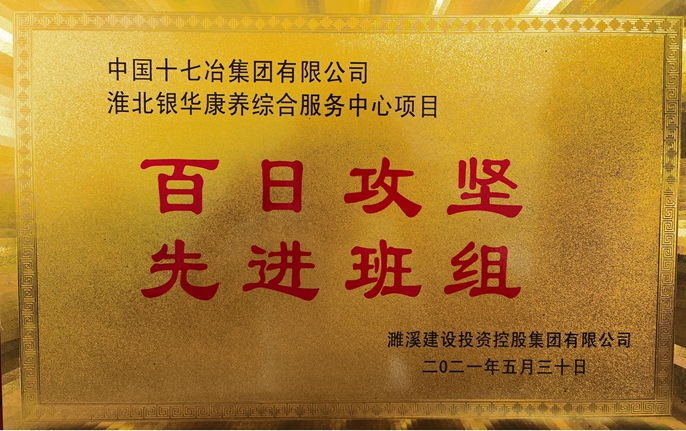 5月30日,中国十七冶集团市政分公司淮北银华康养项目荣获濉溪县建设投资控股集团有限公司颁发的“百日攻坚先进班组”称号。