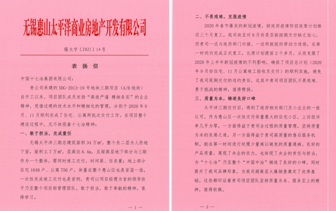 6月25日,江苏省无锡市惠山太平洋商业房地产开发有限公司向中国十七冶集团致表扬信,对房屋分公司无锡太平洋三期项目团队发扬企业精神,优质高效完成项目住宅、公寓两批次交付工作给予高度肯定和表扬。