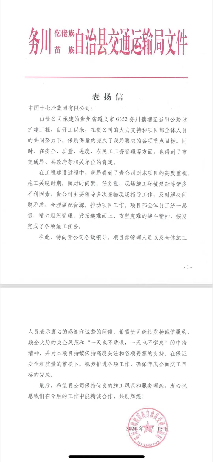7月15日,遵义市务川县交通运输局向中国十七冶集团致表扬信,对中国十七冶集团路桥工程技术分公司G352务川藕塘至当阳公路改扩建工程项目部攻坚克难推进工程进度、保质保量完成节点目标给予表扬并表示感谢。