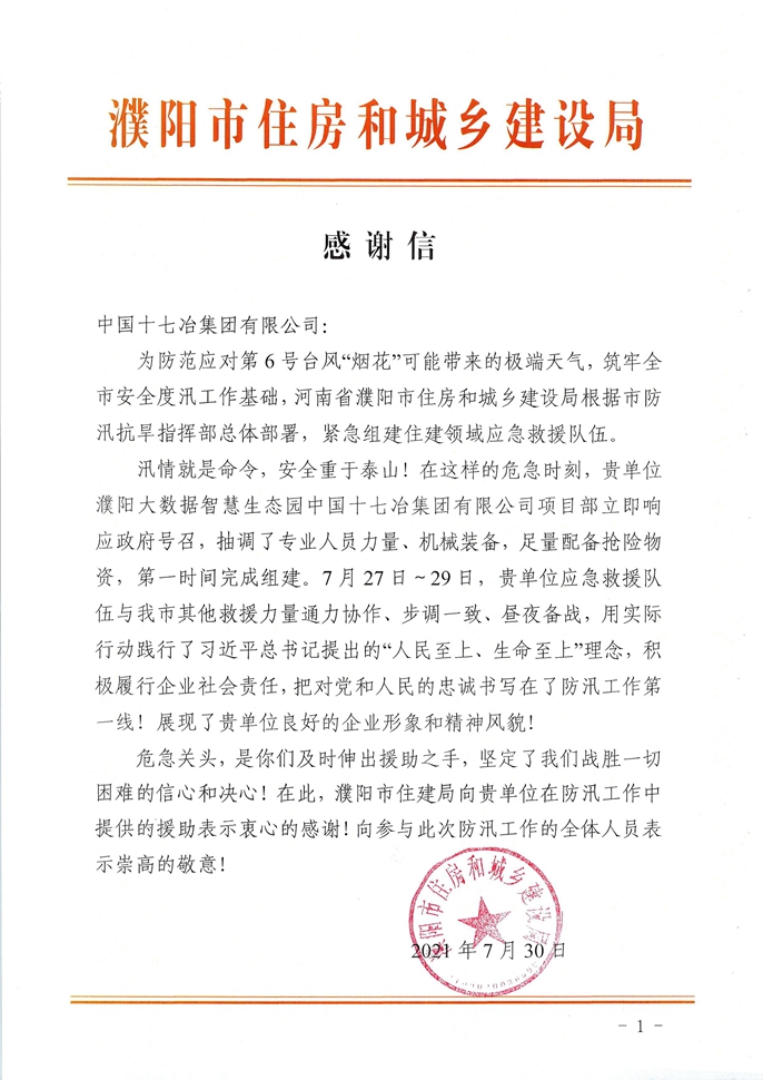 7月30日,濮阳市住房和城乡建设局向十七冶致感谢信,对十七冶濮阳大数据智慧生态园项目部在防汛期间提供的援助表示衷心的感谢,向此次参与防汛工作的全体人员表示崇高的敬意。