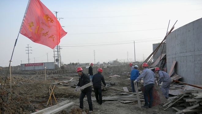 由于工期紧、劳动力紧张,沉淀池立模拆除后来不及清理,影响了下道工序的施工。突击队长章义高和党小组长李明商议,决定在夜班结束后组织一次突击清理行动。清理拆除模板可不比支模时省力,方木、大板上有很多裸露的钉子,浸了水或结上砼后比正常的大板要重20-30斤,有的连体模板加方木重达200多斤,不小心还会扎手扎脚。劳动中,他们不叫苦不喊累,能扛的一人扛,扛不动的两人抬,心中只有一个信念:我在大干动员会上作过承若。就这样,经过三个小时的突击清理,清运钢管500根、方木7立方米、大板300余块、加固用钢筋10吨,把直径60米的南沉池内外拆除清理的干干净净。
