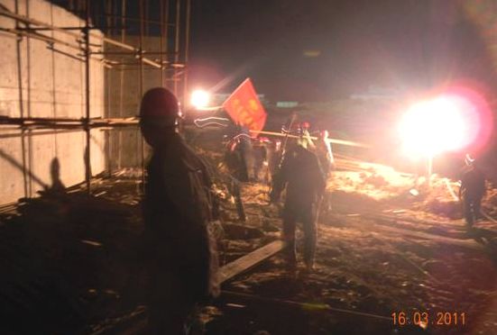 3月17日,又是一个风高夜黑的深夜。暮色中,污水厂工地灯火通明,党员突击队的10名队员正在挑灯夜战。随风飘扬的队旗下,他们搬模板、扛方木、捡扣件、运钢管、拉钢筋,不停的忙碌着。