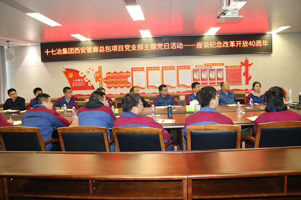 11月10日下午,十七冶西安管廊总包项目党支部组织全体党员及入党积极分子开展纪念改革开放40周年主题座谈会。座谈会上,大家共同观看了《将改革开放进行到底系列论坛》第一讲,跟随着镜头认真听取了行业专家针对改革开放40年来我国经济发展取得的成就、站在新的历史起点上,该如何将改革开放推向深入、如何大力推进“一带一路”建设、如何加强生态环境治理等问题的详细解说。大家从自身的成长工作经历、切身感悟出发,敞开心扉交流讨论了改革开放以来祖国繁荣发展、科技教育强盛、医疗制度完善、公司发展不断壮大、个人生活持续改善等。